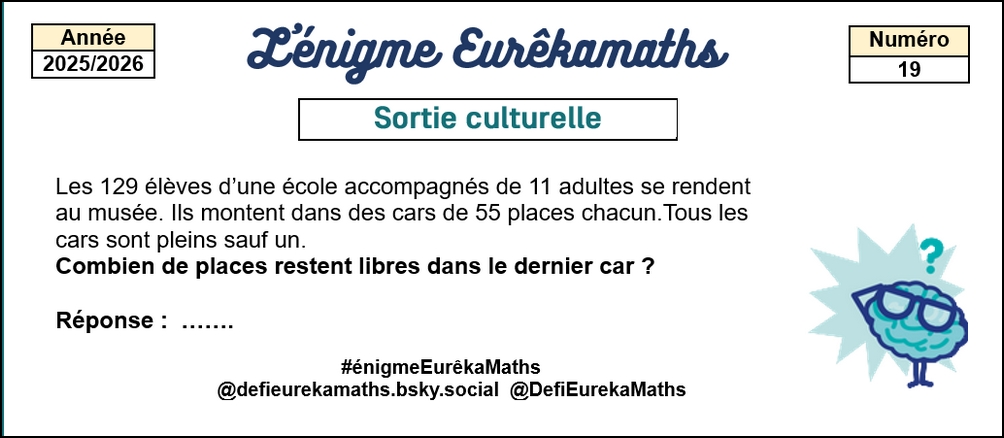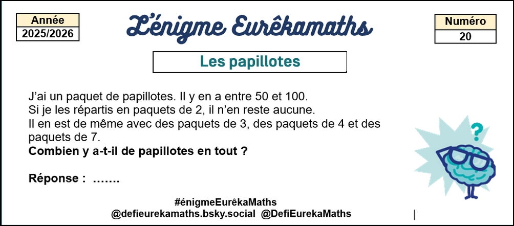 Chaque lundi, Eurêkamaths publie sur son compte X-Twitter et sur Bluesky une énigme à résoudre dans l’esprit du concours : la classe doit se mettre d’accord pour proposer une unique réponse.