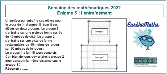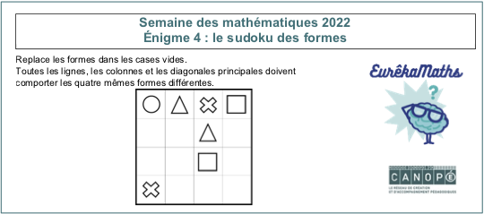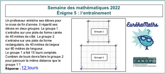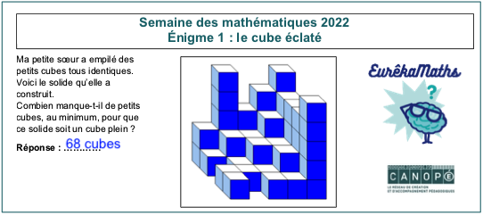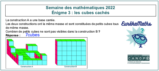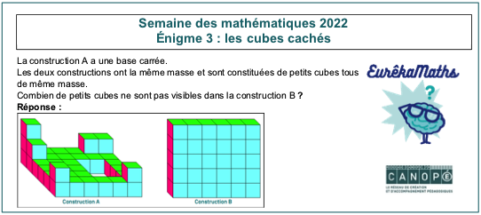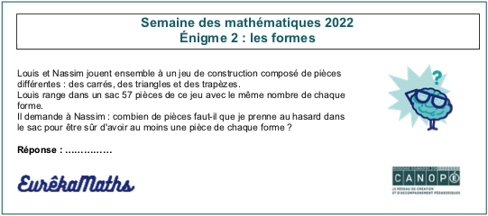 Eurêkamaths a diffusé dans ce cadre une énigme par jour, du lundi 7 au vendredi 11 mars sur son site et sur Twitter avec les mots-dièse #Eurêkamaths ou #SemaineDesMaths ou #1énigmeparjour.