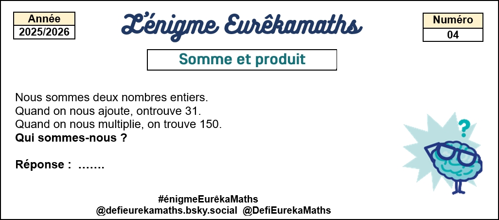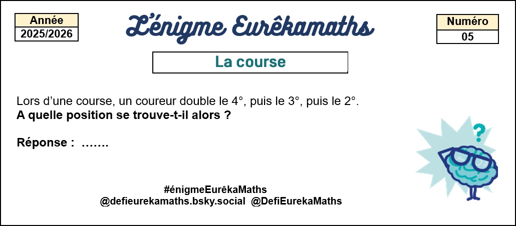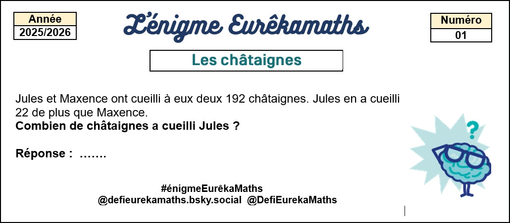 Chaque lundi, Eurêkamaths publie sur son compte X-Twitter et sur Bluesky une énigme à résoudre dans l’esprit du concours : la classe doit se mettre d’accord pour proposer une unique réponse.